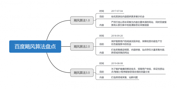 這里大家也是很容易看出三次算法是層層升級的,從不明確到明確,從個體到群體。所以大家以后再看每一次百度算法的時候一定要回看一下此算法的歷史版本,就以百度颶風算法為例,當百度推出颶風算法3.0的時候難道就不打擊颶風算法2.0中的內(nèi)容拼接了嗎?答案當然是錯的,歷史算法是持續(xù)生效,不斷升級,覆蓋違規(guī)站點逐漸增多的。